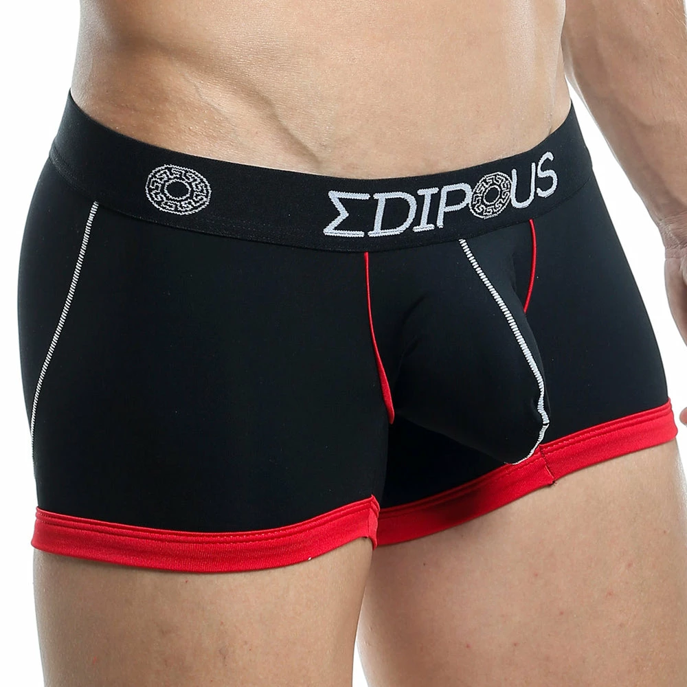 A thin contrast piping around the pouch and wide contrast piping around the legs makes it strong and sexy. The brand name on the wide elastic waistband looks fabulos of this boxer trunk