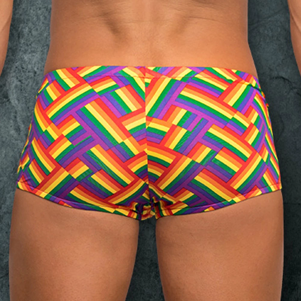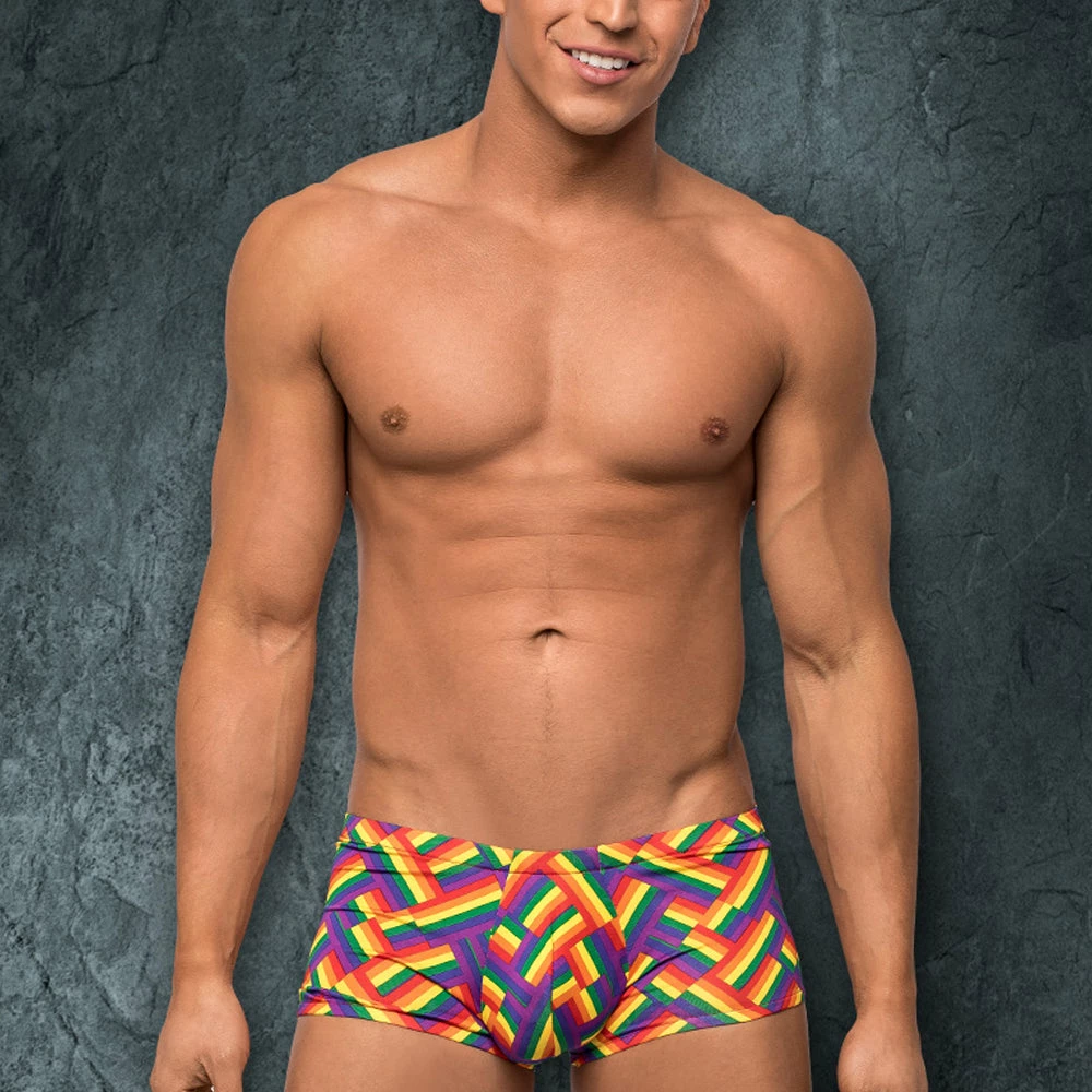 From the Pride Fest collection by Male Power, this style includes: A mini short with a low rise waist and high-cut legs featuring our contoured comfort pouch and full rear coverage. Multicolored festive rainbow print in a herringbone pattern. Stretchy and breathable, lightweight poly spandex.. 85% Polyester 15% Spandex. Hand wash separately, cold water, line dry. Do not bleach.